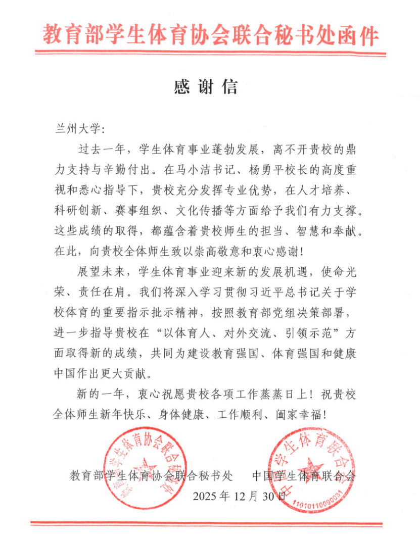 近日,教育部学生体育协会联合秘书处、中国学生体育联合会向兰州大学发来感谢信,对学校过去一年在学生体育事业发展中给予的鼎力支持与辛勤付出致以崇高敬意和衷心感谢,高度肯定了学校在人才培养、科研创新、赛事组织、文化传播等方面的突出贡献。